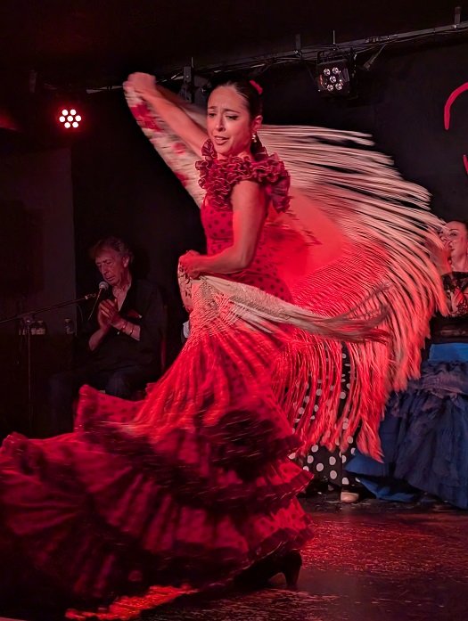 And speaking of nighttime. Brenda got tickets to a Flaminco dancing show last evening and it was just terrific. There were 4 dancers, two singers and a guitar player. We had amazing seats, literally three feet from the dance floor. To watch these dancers up close while drinking a sangria was very special. This photo, of one of the dancers captures the drama of the moment pretty well. How she tossed her long skirt as she twirled made me wonder how often she ended up landing on the floor during practice. Check out this very short video of her finale.