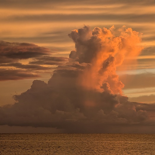 “Bob Osborn (Member 54,749) was sailing the Atlantic Ocean between Bermuda and Horta island in the Azores, Portugal, on the sloop Pandora, when he spotted a Cumulus congestus cast in menacing orange by the setting Sun. This cloud appears to be dissipating, but according to Bob, it did not intend to go gentle into that good night. ‘A few hours later, we had to reduce sail as the strong winds passed over us,’ he said. ‘For certain, this beauty was a beast.’“