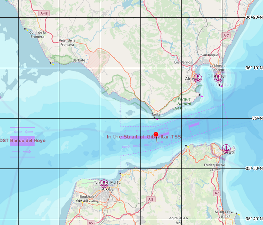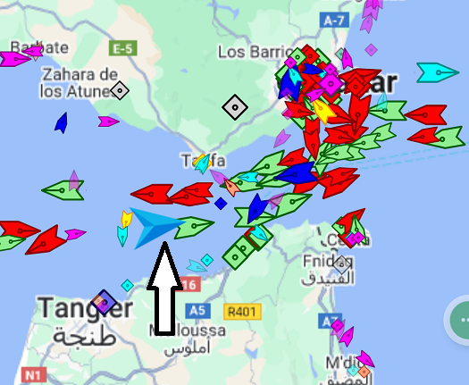Shaken and really ready to be in port, I was on the southern side of the Gibraltar shipping channel. I found crossing the busy channel to be more than a bit nerve wracking as I threaded my way behind ships with the hope of getting out of harm’s way before the next ship came up on me. This shows just how busy it was. Note the arrow I have placed on the image which is where we were shortly after the attack.
