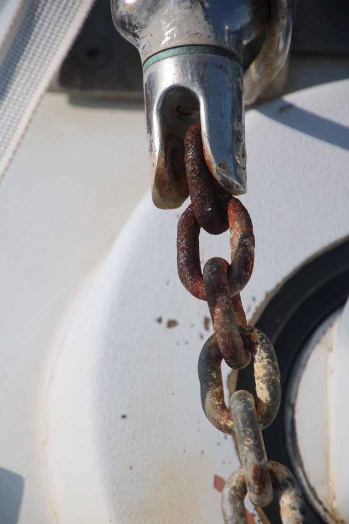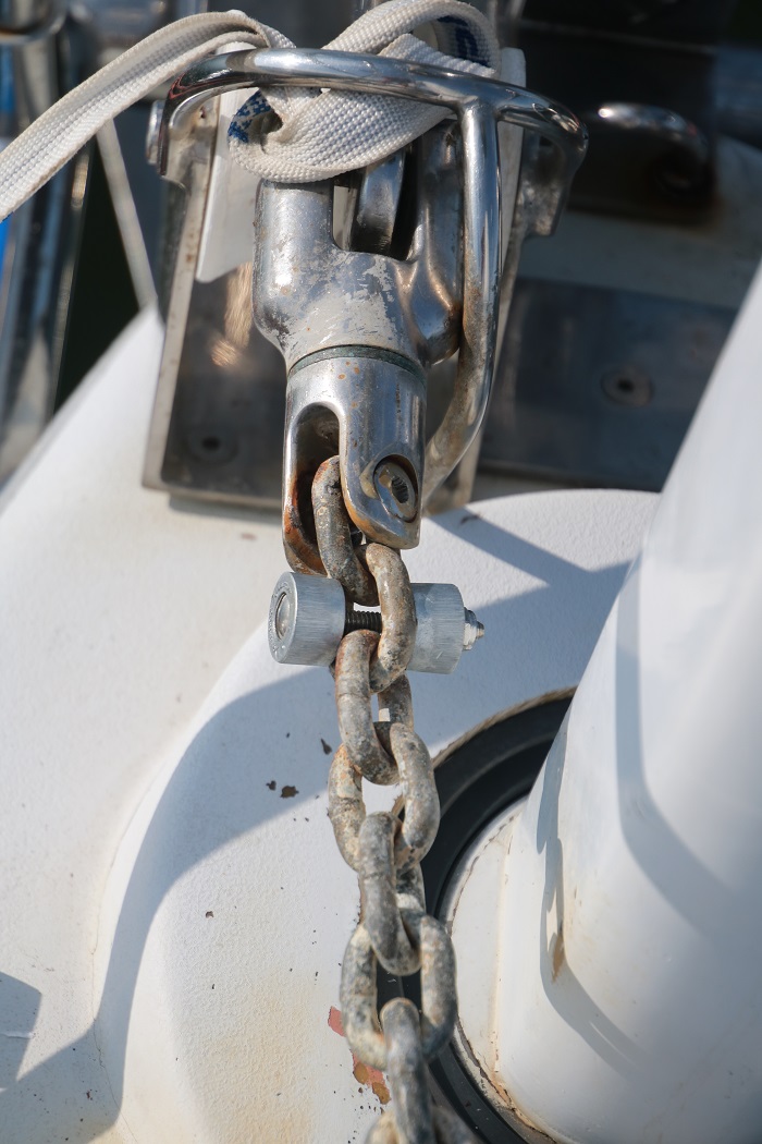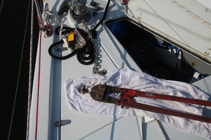 I spent Friday night back aboard in Wickford, perhaps one of my favorite spots anywhere.  Very friendly and homey. I expect that the Lab on this paddle board feels the same, probably thinking, “this is my BEST DAY EVER!”  Well, either that or “I wonder when I’ll get another cookie?  that would make today my BEST DAY EVER”This home at the entrance of  Wickford harbor is particularly charming.  Before I close, a bit of housekeeping.  Pandora sports a stainless steel anchor and a galvanized steel anchor chain.  The problem is that when stainless and galvanized chain are linked there is a tendency to have the first few chain links loose their galvanizing due to electrolysis because stainless is a much more “noble” metal.   Each year I have to cut off a few links to remove the ones that have become rusted.   It’s not hard to see that this isn’t a good thing.   What to do?I borrowed a bolt cutter from the yard and clipped them off.  It was alarmingly easy.  What a scary pair of scissors. So, an experiment.  I secured two small sacrificial zincs, designed to corrode easily and save the more important metals from damage.   It’s not a perfect solution but I hope it will help.  I’ll report back on that.