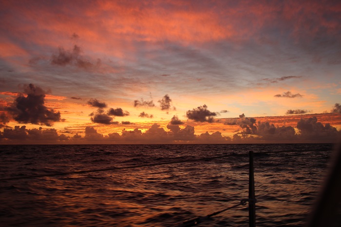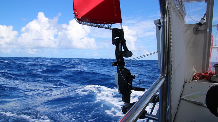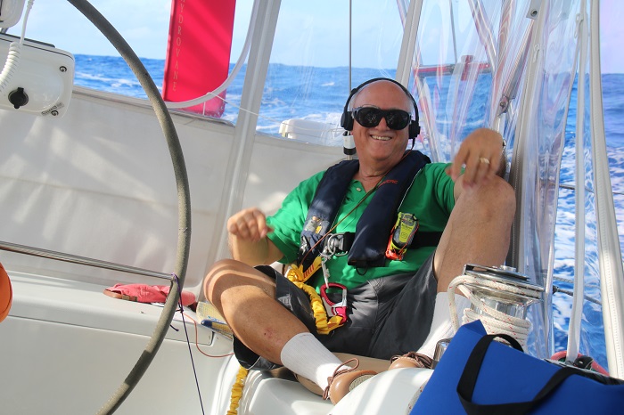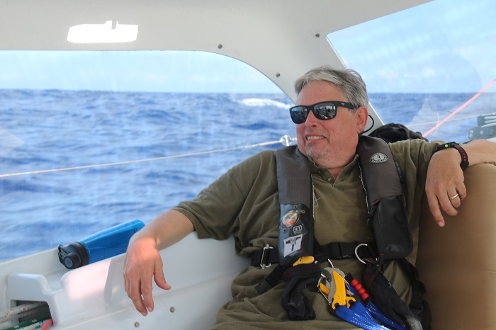 We had moments of frustration, like when the main halyard parted and the sail came crashing down on the deck, but there were moments of serene beauty like the stunning sunrises every morning. I found that I could watch the receding wake as our vane steered along tirelessly.George spent hours listening to music, sometimes loosing himself in the moment during night watches and singing WAY LOUDER than he realized.  Love those cool shades?  Totally hip?  You be the judge.Cliff just enjoying the view a few days after he recovered from early-on mal de mer.  With Pandora in cruising mode, it was pretty much a wreck down below, at least it seemed that way to me, the anal skipper with all the cushions covered with canvas sheets.   These covers really proved their worth as we discovered leaks we didn’t know we had.  Isn’t that always the way?While we had our share of squalls, we had many many hours of wonderful sailing, ably assisted by our newest crew member, our windvane steering unit, Lisa.  I understand that most crews so attached to their vanes that they give them names, unlike electronic pilots that often end up with names that are not altogether complimentary.  After years of sudden changes in course, Pandora’s electric pilot is “Crazy Ivan”.