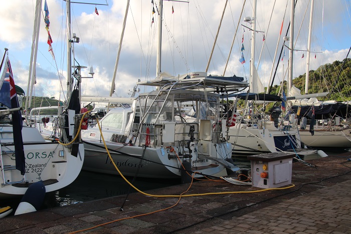 We arrived in Falmouth Harbor Thursday morning at 04:00 only to discover that my anchor windlass would not deploy so we picked up a mooring.  Fortunately, the problem was minor, a tripped circuit breaker so after throwing the switch it worked again.   After a swim, a beer and a bit of celebratory rum as the sun came up, we moved over to the dockyard, Pandora’s home for the next week.