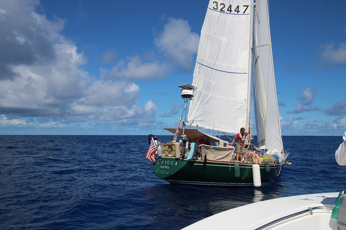 I mentioned in my last post that one of our boats, Cayuga, had lost the use of their engine when their engine water pump went bad and with the light winds that slowed down the entire fleet, they found themselves drifting slowly southward at a painfully slow pace for way longer than they wanted to. Finally, they were within a reasonable distance of Antigua and Paul, who operates the Admiral’s Inn with his sister Astrid, offered to run the new water pump out, along with some antifreeze.