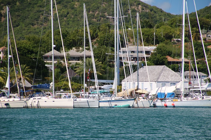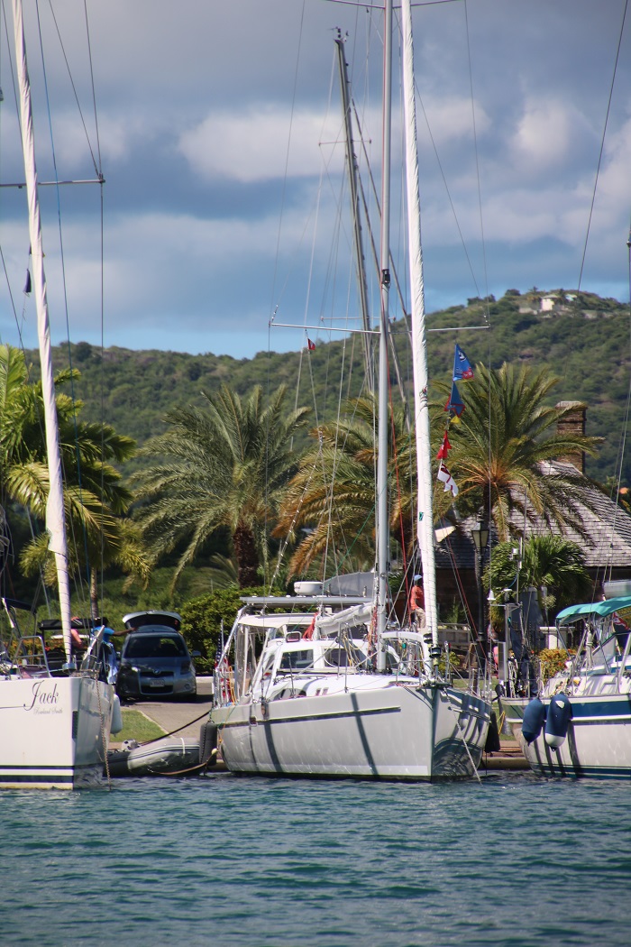 Back to English Harbor and the fleet on the dock. There’s Pandofra in the middle.