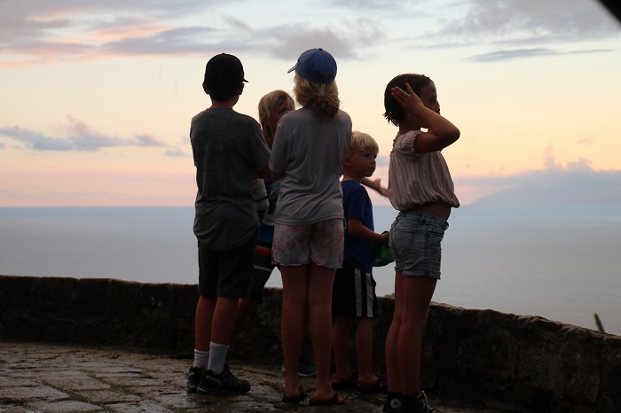 So, it was fitting that our last “official” even was on Friday in the Dockyard, in spectacular venue, in one of the old historic buildings.   It was a beautiful space and wonderfully photographed by Brenda who preferred being a spectator to gulping an alarming amount of rum. The group gathered under the stars. Mike and particularly Ann, my sponsor when I joined the group two years ago, were there preparing the Tot.  Of course, there were readings from British Naval history.Introductions of our guests by me. Bottoms up.  Of course, the “tot” must be swallowed in a “single go”.  I’ll admit that it burns. One of our events was an evening BYOB on Shirley Heights, a historic lookout for the British Navy.  We went up to watch the sunset, normally spectacular.  However, a huge squall came through and brought very limited visibility an many wet Dawgs.  I just love this photo of some of the kids from the rally enjoying the view.  What a great group.  Brenda and I have noticed, over the years,  that “boat kids” are universally wonderful and seem to have social skills that are far above the norm.  Perhaps I’ll leave it at that for now as I have to pack to head home to see our own grandchillen.