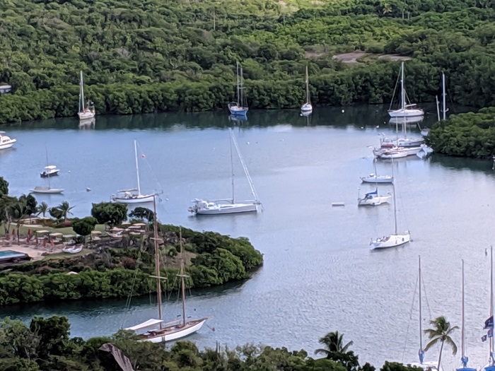 And speaking of Pandora, even if I wasn’t, a friend sent this great drone shot of her on her mooring in English Harbor where she’ll be while we are jetting around. Awesome perspective. Hint, she’s in the middle of the photo.