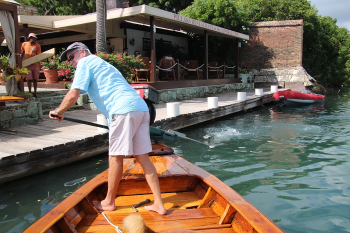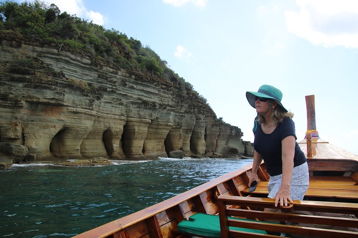 I have always associated this sort of boat with James Bond, who’s Long Tail was a bit more sporty than Paul’s.Anyway, Paul’s boat is more my speed. And, at a stately un-Bond pace, we headed out of the entrance of beautiful English Harbor, home to the British Navy during the age of sail. Just outside are an interesting rock formation called the Pillars of Hercules. I am told that it is a great spot to dive or snorkel. In the bow is Astrid, Paul’s sister and partner in the Admiral’s Inn.