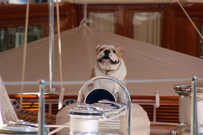 I had to get special permission from the guard on the dock to get close to her. Fortunately, I knew the guard, Shirley so she just waived me by. Guarding aboard this one was a “yacht yard guard dog” following my every move, sitting on one of her huge winches, perhaps a favorite perch. Or was it a guard dog bed? Only he knows.