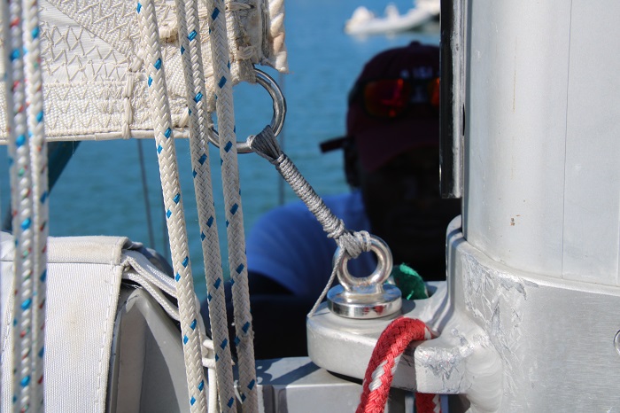 We have a parade of tradesmen coming by Pandora this week, first to re-install the mainsail that had been damaged on the way south this fall. It turns out that in addition to some repairs, I needed a few relatively minor adjustments to how the sail was attached to the goose-neck to get the sail to set in a way that wasn’t going to put a strain on any of the fittings. One problem in particular, is that I had not attached the clew of the sail to the goose-neck properly in the past, with it pulled to tightly to the mast. It’s now offset somewhat and looks much better when the sail is up, a minor but important change that should help things hold together better.
