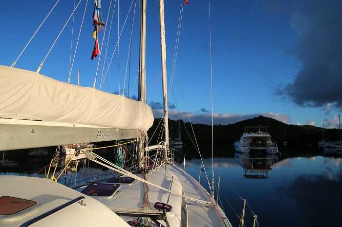 The normally strong trade winds have been light which has made sleeping a bit tough as it’s pretty warm down below in the evenings, without a cooling breeze. But, what a beautiful view of the still waters in the early morning light.