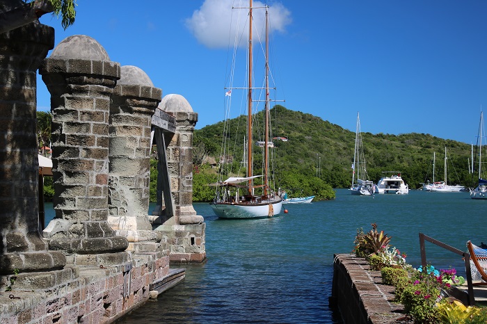 And a view of the Admiral’s Inn and the beautiful classic schooner, Mary Rose, to our stern, glowing. The pillars to the left once formed the base for the Georgian era sail loft that served Lord Nelson’s navy when this harbor was England’s base of operations for the Caribbean or West Indies. The British fought hard to keep control of what is still perhaps the best harbor in the Caribbean.
