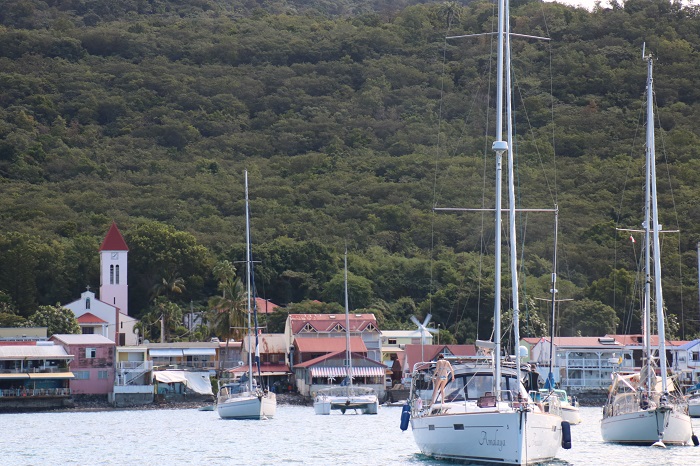 After more than three weeks in Antigua we headed off to Deshaies, Guadaloupe yesterday,  a bumpy and fast 50 mile run south to the next island.    This tiny harbor is a popular spot with cruisers and yet, when the wind is up, can be a tricky place to anchor, with winds that can really whip down off of the mountains overlooking the harbor.