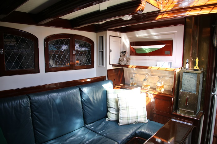 Perhaps a good place to start is in the cockpit with her lovely wheel and binnacle. Note the nod to the modern, her lovely brass lamp has been refitted with an LED bulb.