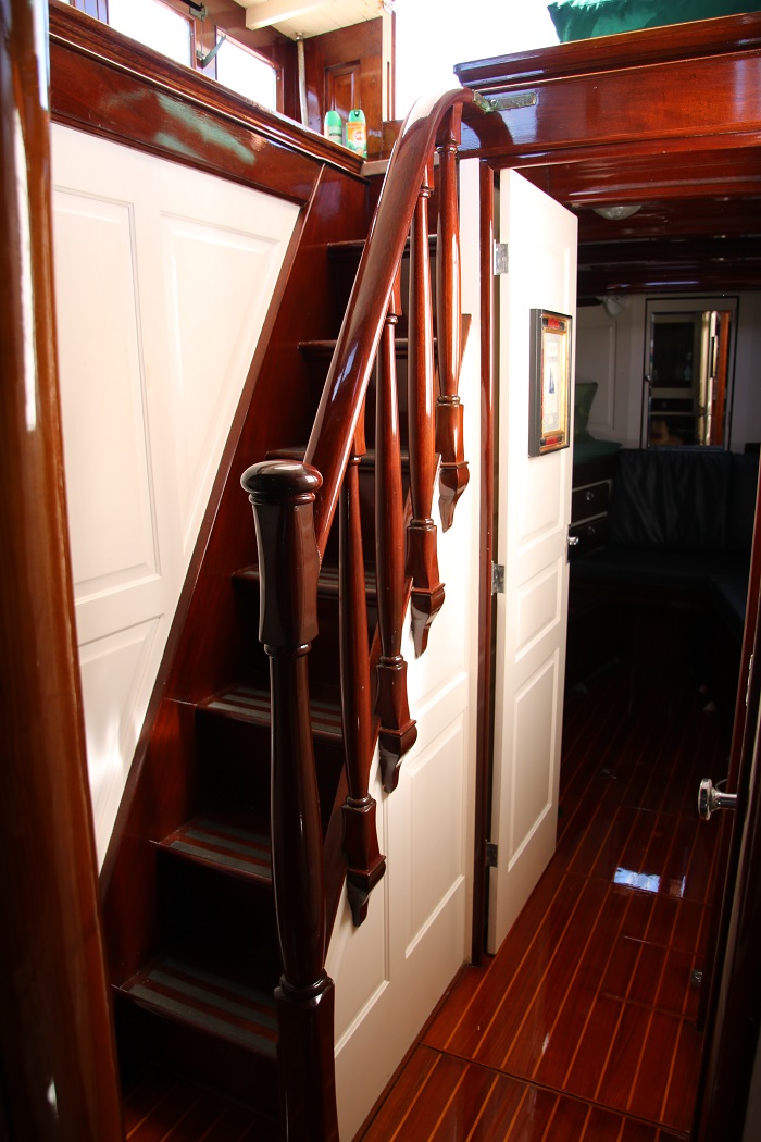 As you head down below. What a banister and the classic “Herreshoff interior” white panels with varnished wood trim.
