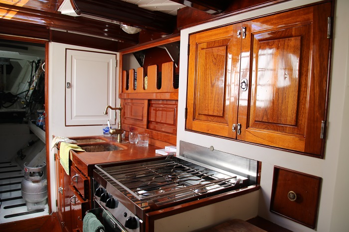A very nice, functional galley. Of course, with the modern conveniences of generator and refrigeration to keep things civilized when cruising.