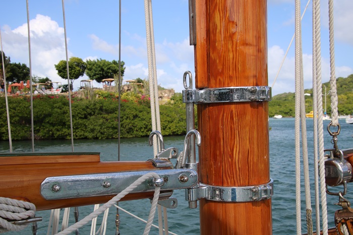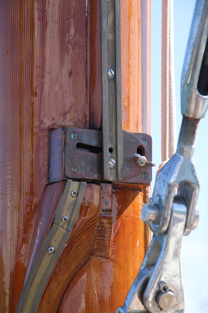 The goose neck, with it’s interesting vertical bar is worth noting. When the sail is hoisted, the boom raises up to the top of the slide.