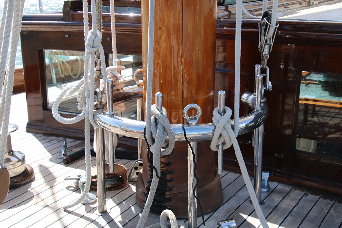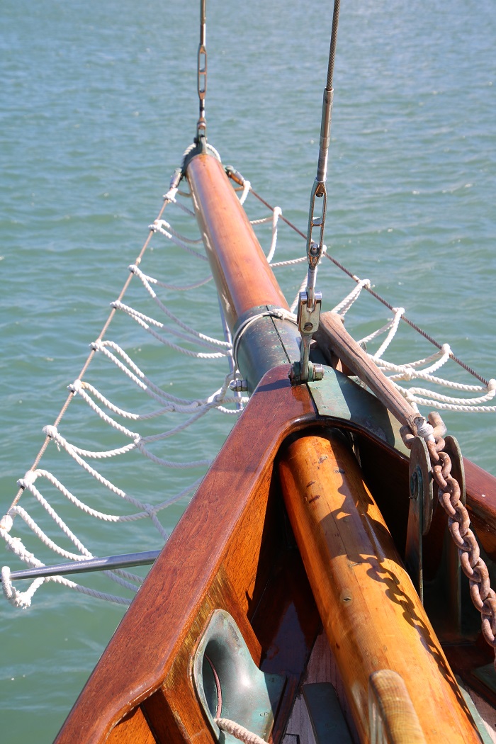 One departure from the original designed to make here easier to sail short handed, was the addition of a boom-kin. Of course, Gerald consulted with experts at the Herreshoff museum in Bristol RI where he sits on the board of directors. It’s a lovely addition and surely Capt Nat, always the innovator himself, would have approved. This change made it possible to remove one of the two sets of running backstays, an important simplification.