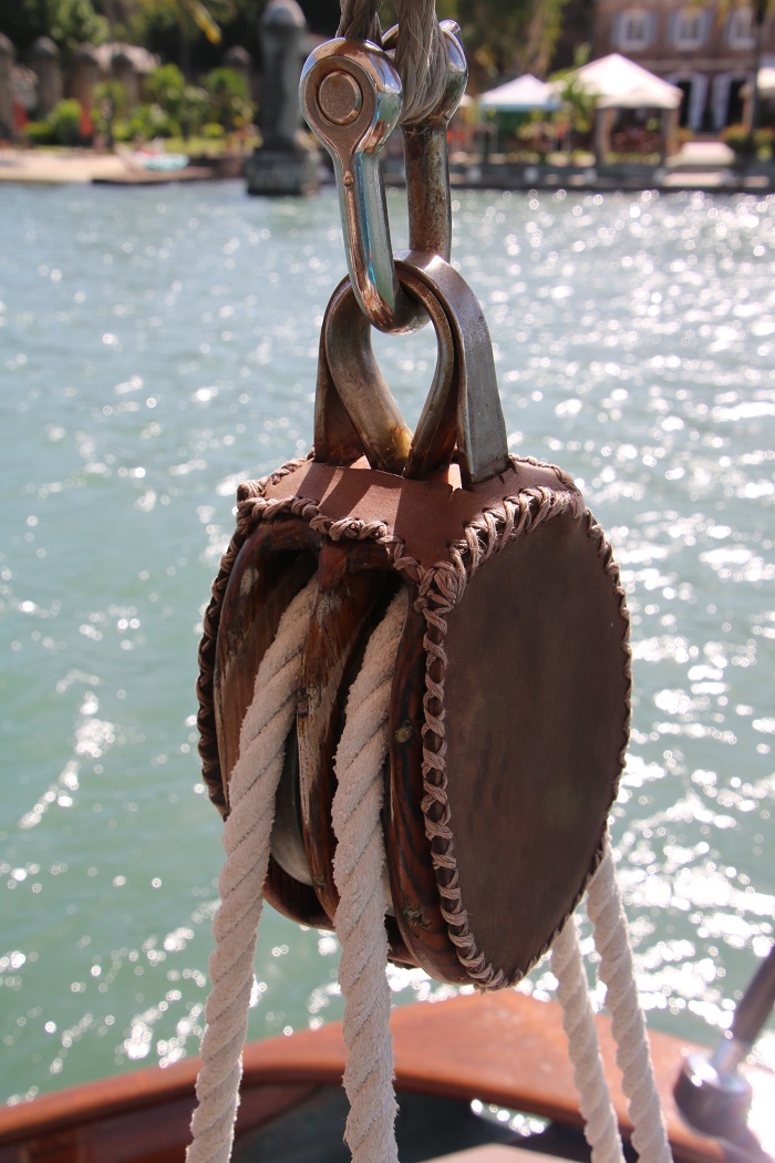 Everywhere lovely leather covers for shell blocks and covering whatever hardware might mar the decks, varnish or paint.