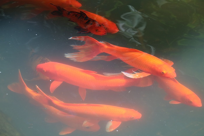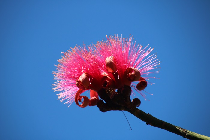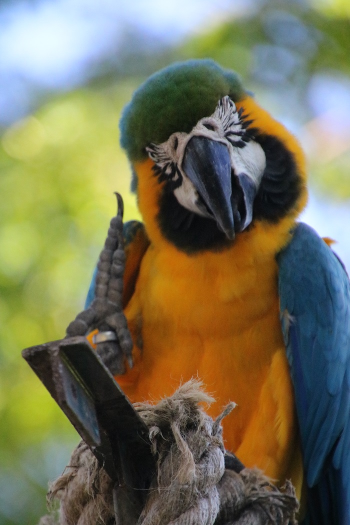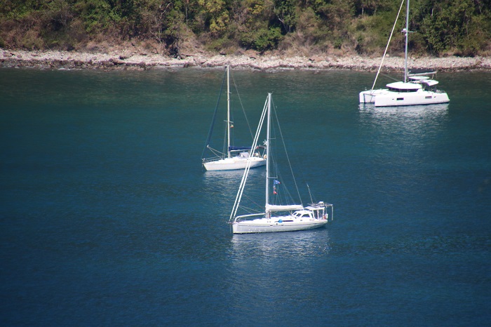 They have a large collection of koi that are always ready for a handout. All of these fish, and there are hundreds of them, are up to two feet long.  While the gardens are mostly focused on plants, there are a number of birds to enjoy including these beautiful parrots that live in a large open air aviary that you can enter and see up close. And who doesn’t like flamingos?This big macaw, seeming to challenge “what you lookin at?” And, of course, lots of plants and flowers, far too many to show here. These puffy flowers show up before the leaves on this tree.  They are 10′ puffs of pink against a perfect blue sky. I love the contrast of the red roofs, a signature style here, against the clear blue tropical sky and even bluer ocean. From the edge of the property, a view of the boats in the harbor.   That’s Pandora, third from the right. Pandora up close. So here we are in Les Saintes, one of our favorite spots to spend time.  We’ve taken a mooring for a week but it looks like we may have to make a run to Martinique soon as the winds are likely to pick up quite a bit and we need to be there or in St Lucia in a few weeks when we hope that the new compressor for our fridge will arrive and none too soon as it’s sounding worse each day.  I sure hope that it doesn’t give up the ghost before the new one arrives.