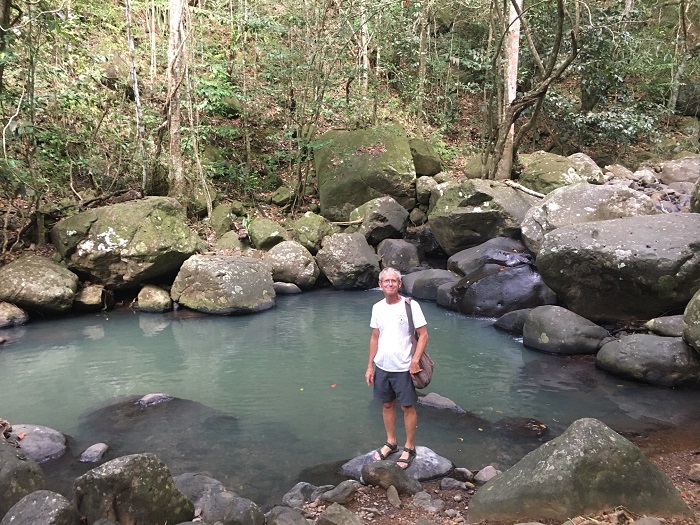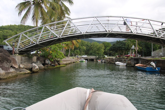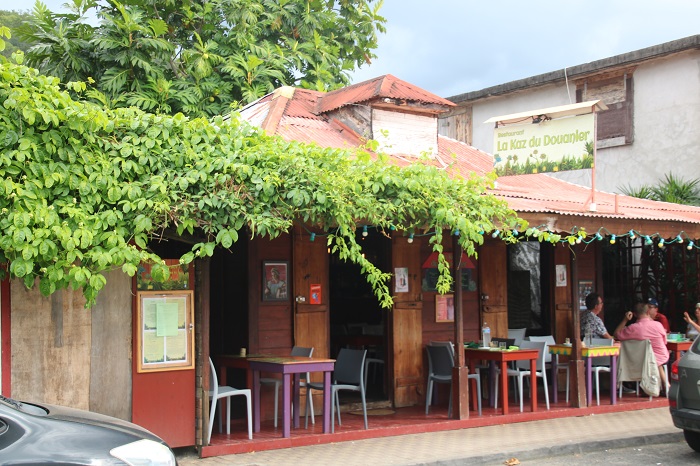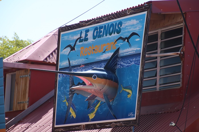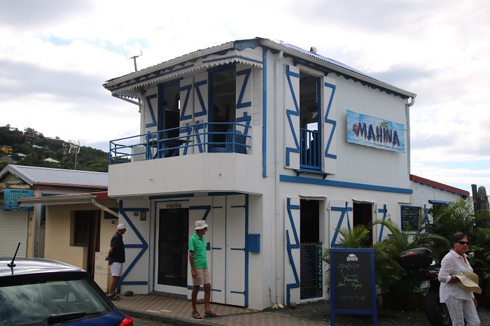 The town, more of a village, and smaller than the town here in Les Saintes, is very quaint, a sort of French shabby chic.The town dock can be a bit tricky when the surf is on, as it was during our visit so we took our dink down the little canal on the Deshais river.   We were told that the week before we arrived the waves were breaking at the mouth of this canal. The swell in the harbor can be so bad that they have to remove the top of the dock to keep it from blowing off with the waves crashing against the shore.   Even when it’s calm, the town dock can be a bit of a challenge to land on. You can walk a short distance up the river and swim in one of the small pools between the cascades on the river, more of a stream, actually.  The water is a bit milky and I expect that is because the water leaches out of limestone springs.    As it is coming directly down from the mountains I doubt it’s polluted.  After this I went in for a swim.  It was chilly but what a change of pace.  Fresh Water!The main street in town is lined with colorful restaurants and shops. We had a terrific meal, French of course, here with some cruiser friends. Each restaurant is more charming than the next.   This particular one is featured in the TV series, Death in Paradise.  Buildings on the waterfront are beaten up from time to time in storms.  I guess this one hasn’t been repaired quite yet.  Fishing is a big part of what goes on in Deshais and every evening and into the early morning before dawn we were rocking and rolling as the fisherman headed out and returned with their days catch.