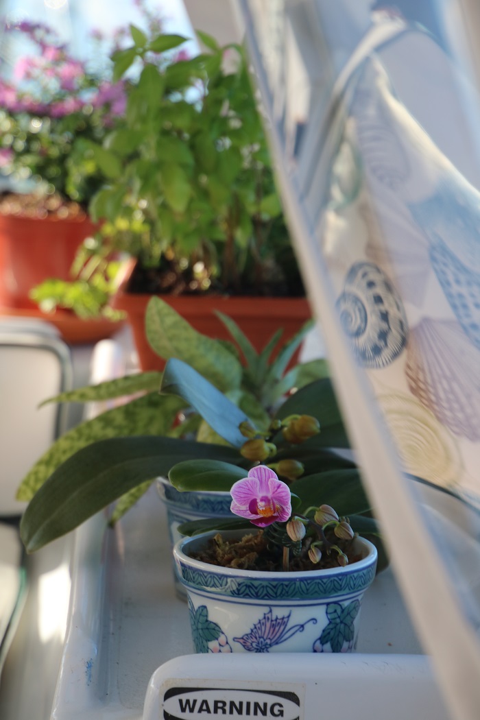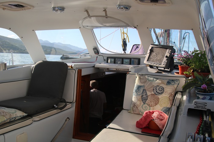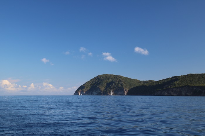 Our cockpit looks a bit like a greenhouse including a few tiny orchids that we smuggled into Antigua, buried deep in our luggage.  They love it here, like we do, and have burst into bloom. Pandora’s hard dodger can be a bit hot when the winds are calm which is almost never and offers a welcome respite from the strong tropical sunshine.    Brenda took this shot, while I made coffee down below, as we made our way south along the west coast of Guadeloupe on our way to Les Saints the other day.   In the lee of the island the waters are very calm and the wind, not so much. The view of Deshais from our stern shows how tiny the cove really is, with a lone sailboat just peaking out,  more of an indent, than a harbor. And the mountains of Guadeloupe in the morning haze to the south were beautiful.  Here in Les Saintes we spend some time most days hunting for groceries, a rewarding effort as there is a remarkable selection of wonderful French food to choose from, and many places to purchase fresh bread, kaiser buns, and terrific cheeses.  Of course, who can resist a nice little rose wine for less than ten euros.   In the US these shops would bill themselves as “gourmet” but here high quality is just expected.