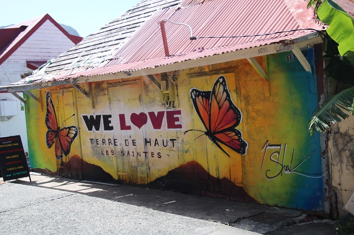 This tiny cluster of islands are very popular with tourists from France who fly directly to Guadeloupe and take the short ferry ride here.  When the ferries arrive each morning they disgorge hundreds of tourists that turn the tiny village from sleepy to bustling in moments, only to melt away as they take shuttles to the inns and hotels scattered throughout the island.The waterfront is so charming with a very convenient dock to pull up our dink. The waterfront looks like a tiny little village on the Mediterranean. Every view better than the last. The muraledesign on this building near the town landing says it well. There are plenty of reasonably priced places to enjoy a terrific French meal.  Last evening we went out for dinner with our friends Mark and Lynn from Roxy and had an amazing dinner of fois gras and lamb chops.  Yum.