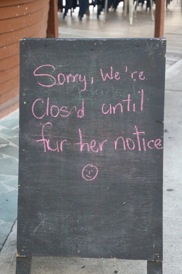 Tables and chairs stacked and all businesses in the marina now closed. You could shoot off the proverbial cannon here and not hit anyone. A week ago, this place was packed. A lone kitty making the rounds. This sign about sums it up.So, here we sit, probably safe from infection given the fact that just about everyone is gone so “social distancing” is not a problem.