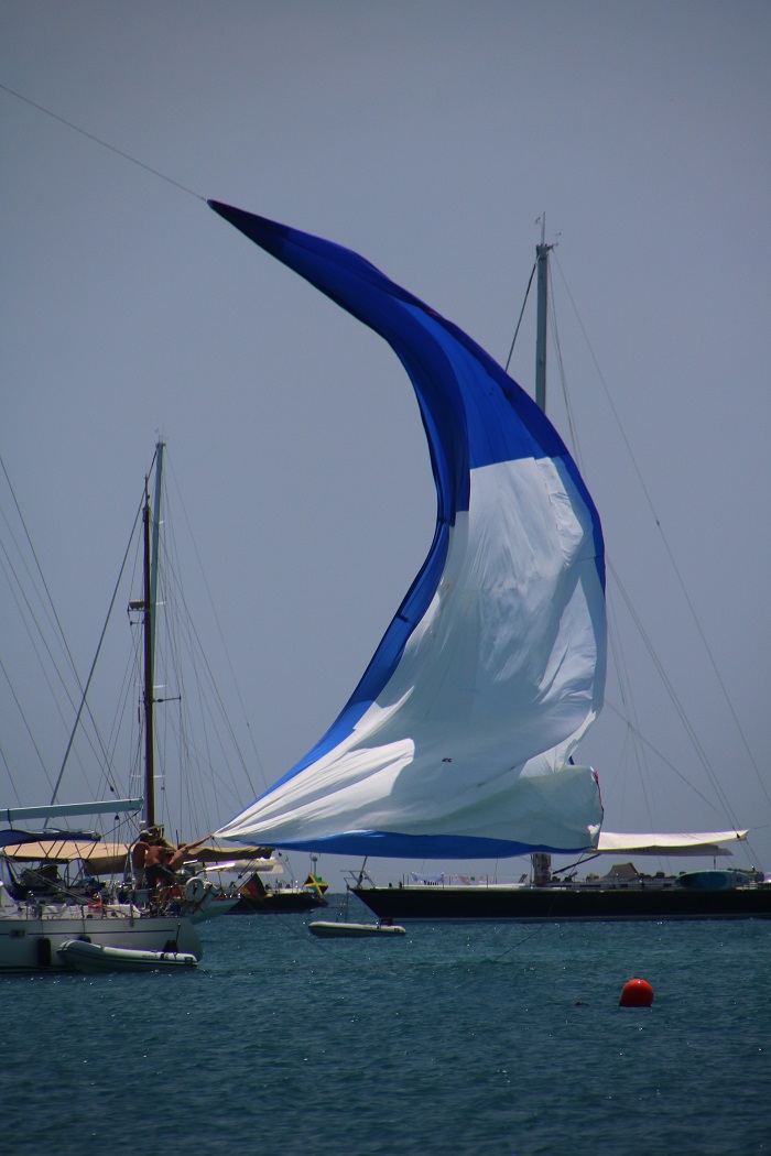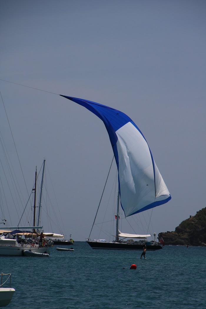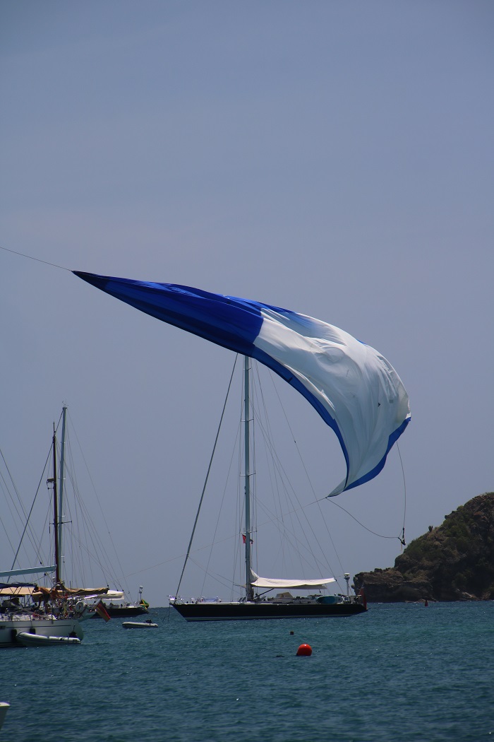 However, most are doing the right thing and are adhering to the “spirit” of what’s being asked of the cruising community.  This morning I saw a guy doing arm exercises on the bow of his boat using some sort of green strap wrapped around the rigging. Yesterday, after nearly a week of very light winds, the trade winds began to fill in again.  This crew deployed their spinnaker to do a bit of “surfing”.  The process involves securing the top of the sail to the mast facing aft with a seat secured to the two lower corners.  When the wind catches the sail just right, up you go. It’s a very tricky maneuver with some risk to both boat and crew.  After one quick jerk out of the water, it suddenly looked  like things might be getting out of control.   A strong gust, would put a lot of strain on their anchor and it would get messy pretty quick if they started to drag.  It seemed to take a long time to reel the flogging sail back into the cockpit.  “Ok, ok, enough fun for one day guys.”So, here we sit, not knowing how long it will be until we are able to head to the US.  It’s still too early to head north anyway with cold fronts making for challenging conditions north of the Bahamas with a constant parade of cold fronts exiting the east coast.