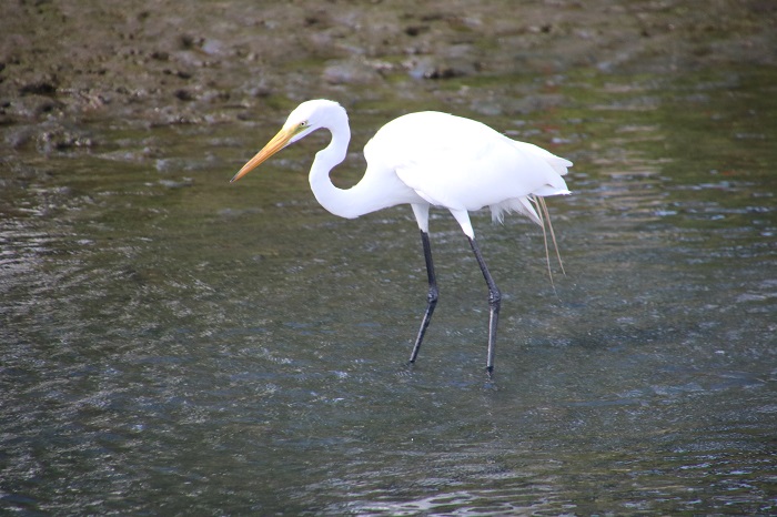 An egret hunting for fish in the shallows.