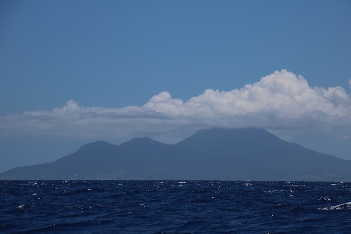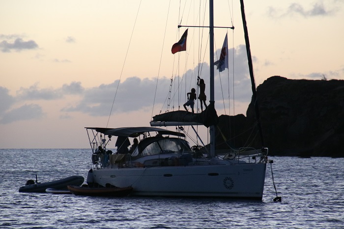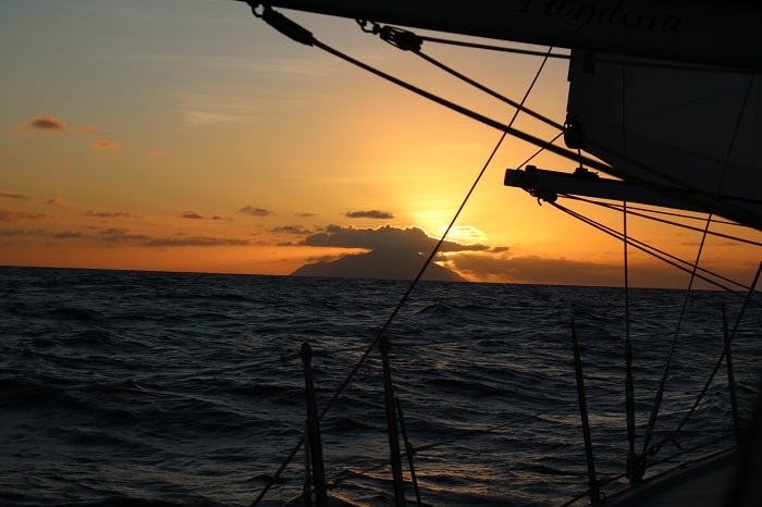 I expect that these two cavorting on their boom were likely more focused on fun than the risk.  Down below, parents holding their breath…So, off we headed the next morning.  Things were very settled for much of the day, mostly with just enough wind to make a decent speed. We passed to windward of Nevis and St Kitts. And into the night as the sun set.  From there, not a sight of land for another 100 miles.  Unfortunately, it became progressively windier and more lumpy.   Brenda wasn’t amused and didn’t feel well at all.  She was only able to stand watch for part of the time.