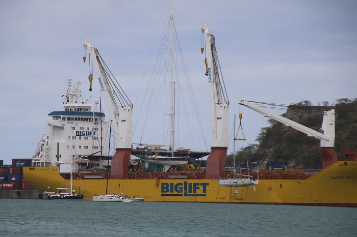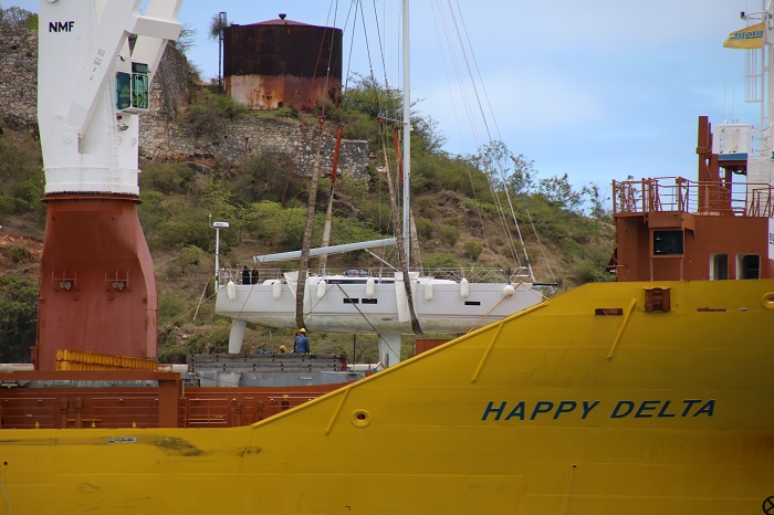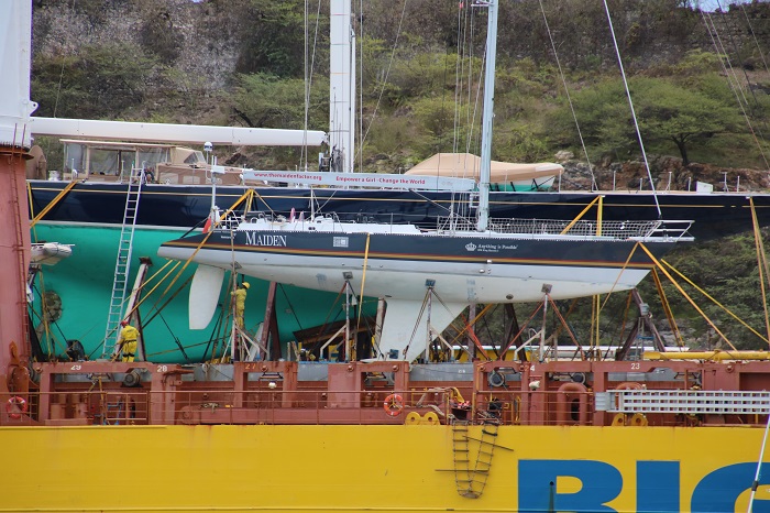 Another boat to be hoisted aboard was Maiden.  We had seen her in Antigua, most recently in English Harbor.  Maiden, the first round the world race boat to carry an all female crew.   Brenda and I enjoyed a showing of the movie about that race at the Antigua Yacht Club back in early January when we first returned to Antigua after the holidays.  How much has changed in a few short months.  When we met the still all female crew of Maiden, they were planning to sail up the US East Coast this spring to visit many yacht clubs along the way.   Not now…It was interesting to see yachts pull up, one after another to be hoisted aboard.  The crew made pretty fast work of getting the boats prepared. In the slings, and over onto the deck.  I’ll admit that seeing all this happen made me wonder at the simplicity of it all as a way to get Pandora home.