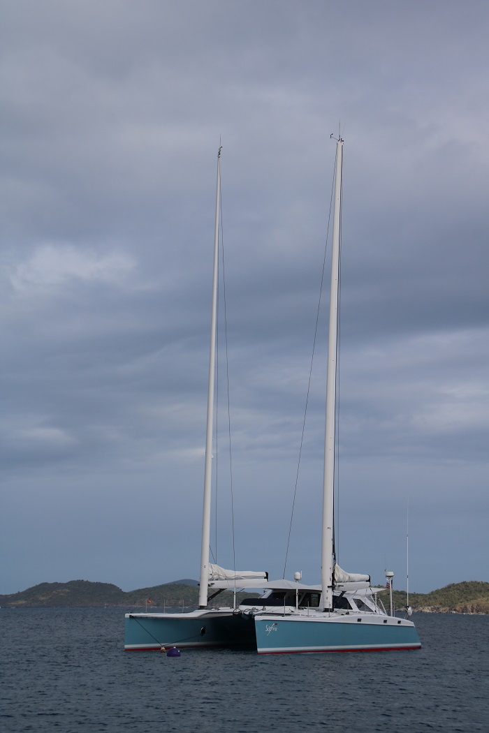 The water here is remarkably clear, more so than any place that we have visited since being in Cuba and the Bahamas and surely more clear than most places in the Caribbean so far.    I’d guess that the visibility is about 40′, much more than the 6′ of Falmouth Harbor, which was more green from algae than the pure ocean blue here.  We are on the closest mooring toward shore, perhaps the best location of all.   On shore is a resort, the Caneel Bay Resort, closed like all others in the Caribbean these days.  However, I don’t think that they will be emerging from lock-down any time soon as the resort, destroyed in 2017 after being in business since 1956 it has yet to be reopened.  It was an eco-resort, opened by Laurance Rockefeller when he owned nearly the entire island.  Their site suggests that they may open up again soon but I didn’t see any evidence of construction or demolition in evidence.  I guess we will have to wait and see.There are dozens of moorings in the area with only one or two opening up most days.  I recall seeing this very unusual catamaran in Antigua a few weeks ago.   Having one mast on each hull.  Very unusual. I think she was designed by Chris White from RI.  It seems that he is known for some unusual designs, many of them multihulls.  Not sure as I wasn’t able to find her design on his site. However, he seems like a logical choice to have been the designer based on some of the details of other models he’s drawn.