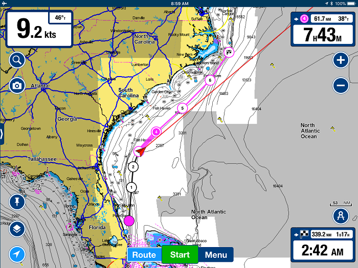 Below is a screen shot of the course we took from Ft Pierce to Hampton. By taking this curved course to the west we were able to stay in the middle of the Gulf Stream and maintain a good turn of speed, covering about 220 miles per day over-the-bottom with a through-the-water distance of approximately 160 miles per day.  The current provided a good lift.