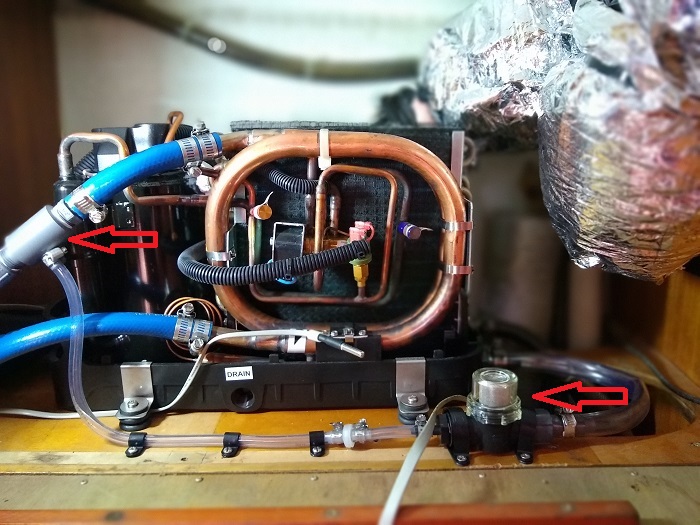 One issue with any AC unit is that they give off a lot of water that drips off of the condenser and can add up to several gallons per day, per unit. Normally, this water drains into the bilge, which isn’t ideal. In this case, the tech recommended that I add a special positive drainage device that installs into the cooling water exit line. It is the grey unit with the red arrow. It also has a small strainer to the right to be sure that nothing can be sucked into the unit and block the tiny exit hole.