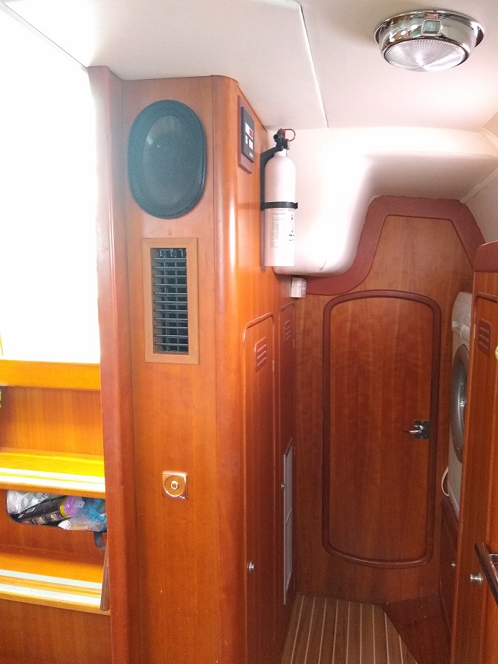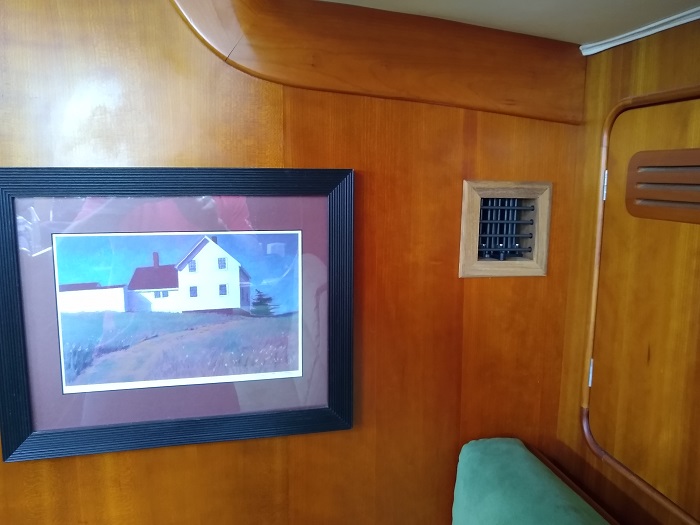 Adding air flow capacity to the system was doubly important as the new unit has a larger blower with greater flow. Now we get 60 degree air blowing right into the galley, where it is needed most. I also split the forward unit so that I could divert some of the cold air from the forward cabin back to the main cabin. That involved putting in a small 4″ louvered vent on the bulkhead adjacent to the unit in the forward locker. That was fairly simple and it is set up in a way so I can close it and divert all of the air into the forward cabin as needed. It is a nice edition and blows cold air over the starboard settee, the hottest part of the main cabin.