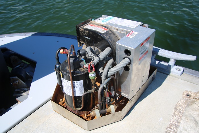 This is the front unit after it was removed, and it sure looked ready for the scrap heap. Note all the rust in the drip pan. I had the forward unit replaced by a tech in FL, but replaced the aft unit myself while Pandora was in Annapolis. It was surprisingly easy although I did have a tech hook up the unit and check that it was running properly.