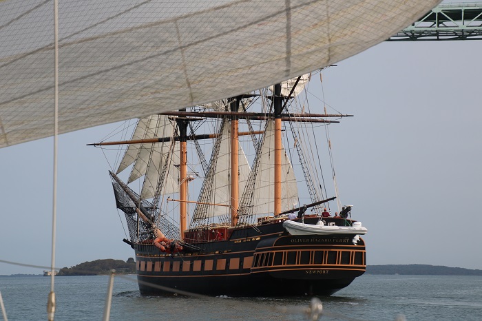 As Craig and I made our way from Newport to Wickford, we were passed by the Oliver Hazard Perry, a reproduction tall ship berthed at Fort Adams in Newport. She was conducting man overboard drills. When the breeze picked up and she put out all her sails, Pandora still passed her easily. The Perry isn’t great in light air, it seems.