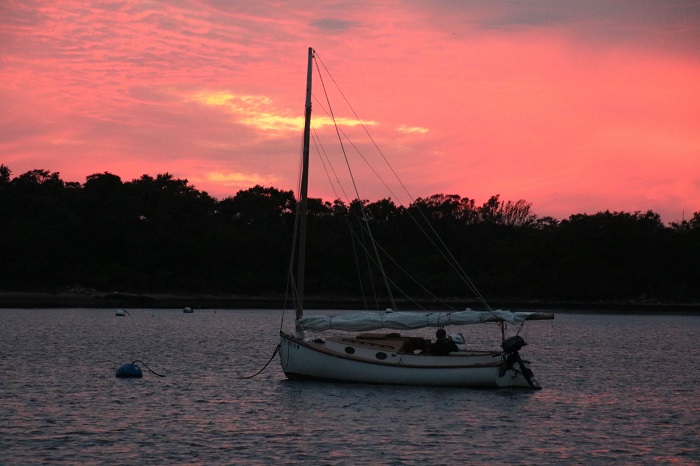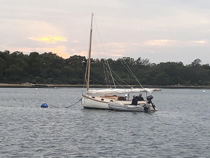 At least we can take solace in the fact that the sun continues to rise and fall every day, always predictable. Our neighbor, the catboat, nicely framed by yet another beautiful sunset.