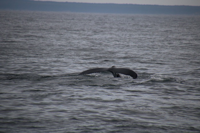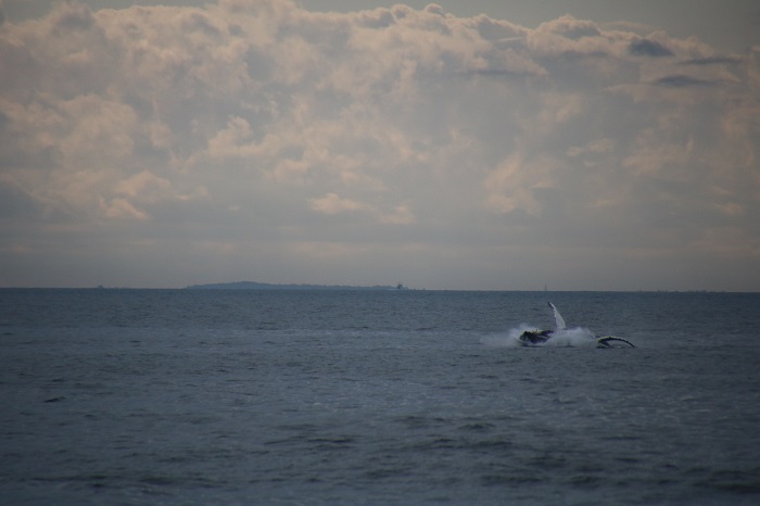 It was hard to tell what was going on but as we got closer, a geyser of foam leapt up again and again. Finally, I realized it was a breaching whale when I saw this enormous dark bulk shoot up nearly clear of the water, only to land with an enormous splash.