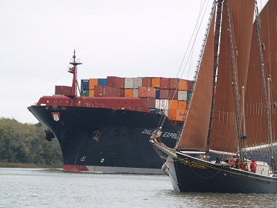 This isn’t the actual ship as I was too busy to get out the camera.   However, it was one more in a constant stream of massive ships that are coming by us as we sit on the dock.  This one was passing a lovely schooner that gives day trips on the river.  Trust me on this.  These ships are very LARGE!!! As I was on the deck getting fenders and lines ready for the tow, I couldn’t hear the conversation going on about Pandora.   It seems that the plan, if Pandora couldn’t get out of the way in time, was for the tug to hit me with his prop wash and push me to the side of the channel.  Remember how narrow it is?  I shudder to think what that prop wash would have done to Pandora as she was blown to shore by the tug.  However, I expect that it would have been a lot less traumatic than being crushed by a 900′ ship.