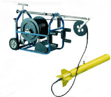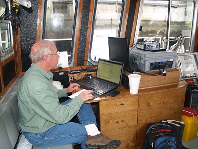 If that’s not cool enough for you, how about the side scan sonar that he can tow behind his boat.  Very high tech.  This isn’t the actual one.  His is a lovely green. The cabin is pretty tricked out. Here’s Fred slaving away at his PC.  Or should I say “at one of his PCs”.  This is his nifty towed sonar.   It looks expensive and Fred said that it is.   I asked him what was the most interesting thing that he had found.  After thinking for a moment he described finding a whole collection of heavy equipment, that’s bulldozers and dump trucks heavy equipment, that he located for an insurance company.  It turns out that someone had stolen the stuff, taken out the engines and had pushed the “remains” off of a barge.  They assumed that they would never be found however I guess that they had not met Fred.  Oops!!