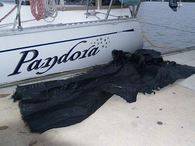 So, I went for swim to see what I had “bought” from lovely Savannah.   I ducked in and under the boat and immediately realized that I had misjudged the visibility in the water.  No, it wasn’t 6″, it was ZERO.  Even with the front of my mask touching the blades of my prop, I COULDN’T SEE A THING!!!  Well, it wasn’t hard to “see” what had caused the problem.  I could easily feel that it was a large piece of polypropylene cloth and I unwrapped it in less than a minute.