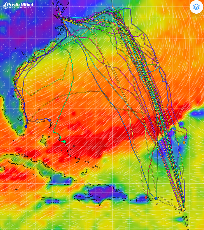 As is nearly always the case, weather plays a big factor in where boats end up and this year is no different. As you can see from today’s tracker, there are a number of boats that are spaced along the southeast US coastline where they have ended up given the drumbeat of difficult weather that they have faced in trying to get to The Bahamas, their choice for this season. As the map shows, there are persistent NE winds, fairly typical for this time of the year, making it impossible to cross the Gulf Stream. So far, only two have made it to their destination of choice.
