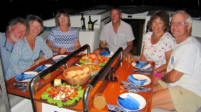 And speaking of the cruising lifestyle, Iain hosted sundowners aboard Fatjax for some of our cruising friends from Roxy, Kalunamoo and Skylark. Bill sent me these terrific photos. Thanks Bill.