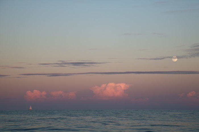 Who can resist the thrill of a full moon rising through the clouds on the first day at sea. This was taken as we approached the Gulf Stream on another passage to Antigua. Look hard to see the sailboat in the distance, the last sighting we had of another boat for the rest of the trip.