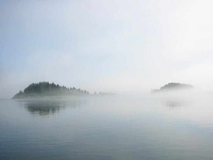 Seeing a moment when rays shoot toward the heavens from behind a cloud always reminds me of that iconic moment when God speaks to Arthur in Monty Python’s Holy Grail movie. Arthur!…Clouds are not always so dramatic. Take these “clouds”, early morning fog shrouding islands in Maine. Fog is clouds or is it “fog are clouds”? Hmm…