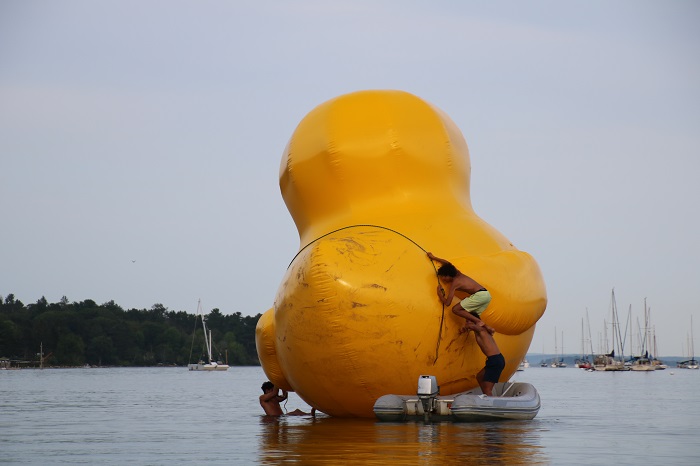 The would-be climbers had things pretty well thought out, I guess, and they proceeded to string a rope over her back so they had something to hold onto. As everyone knows, rubber duckies are notoriously slippery. To keep her from rolling over, one guy got into the water (very cold water) to balance things out.