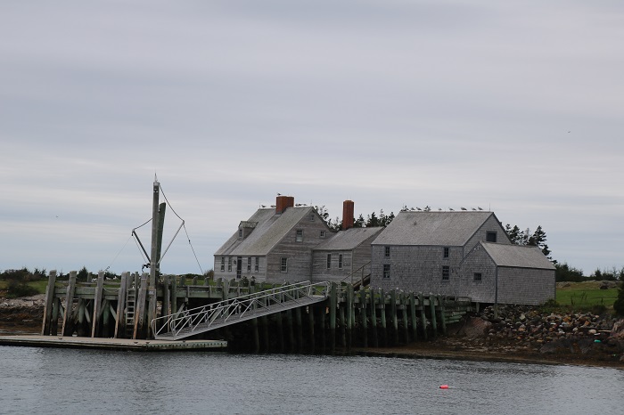So, change of topic. Since leaving Rockland a few days ago, Brenda and I made a brief stop at Allen Island, summer home of Andrew and Betsy Wyeth. They owned, two islands off of Port Clyde, Allen and Benner Islands for many years and built a number of homes on both islands. It is clear that a great deal of thought went into the design and siting of each dwelling as they blend into a wonderful image that evokes one of Andrew’s paintings. They were even careful about who they picked for their dock builder and the instructions they gave him. The ramp, the supports and railings, and the dock protection, everything was on point and made for people like us that like to sail around and visit here.