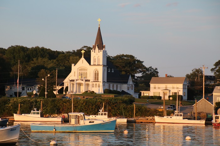 Booth Bay Harbor is a beautiful spot and one that we have visited many times over the years. The harbor is well protected and this church is particularly stunning when the sun is setting. At night the face is lit.