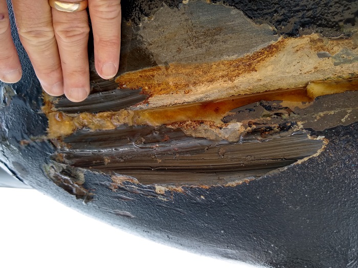 Fortunately, when we hit, we rode up on the rock as opposed to hitting the keel dead on, so the damage was cosmetic and on the bottom of the bulb. It looked very nasty.